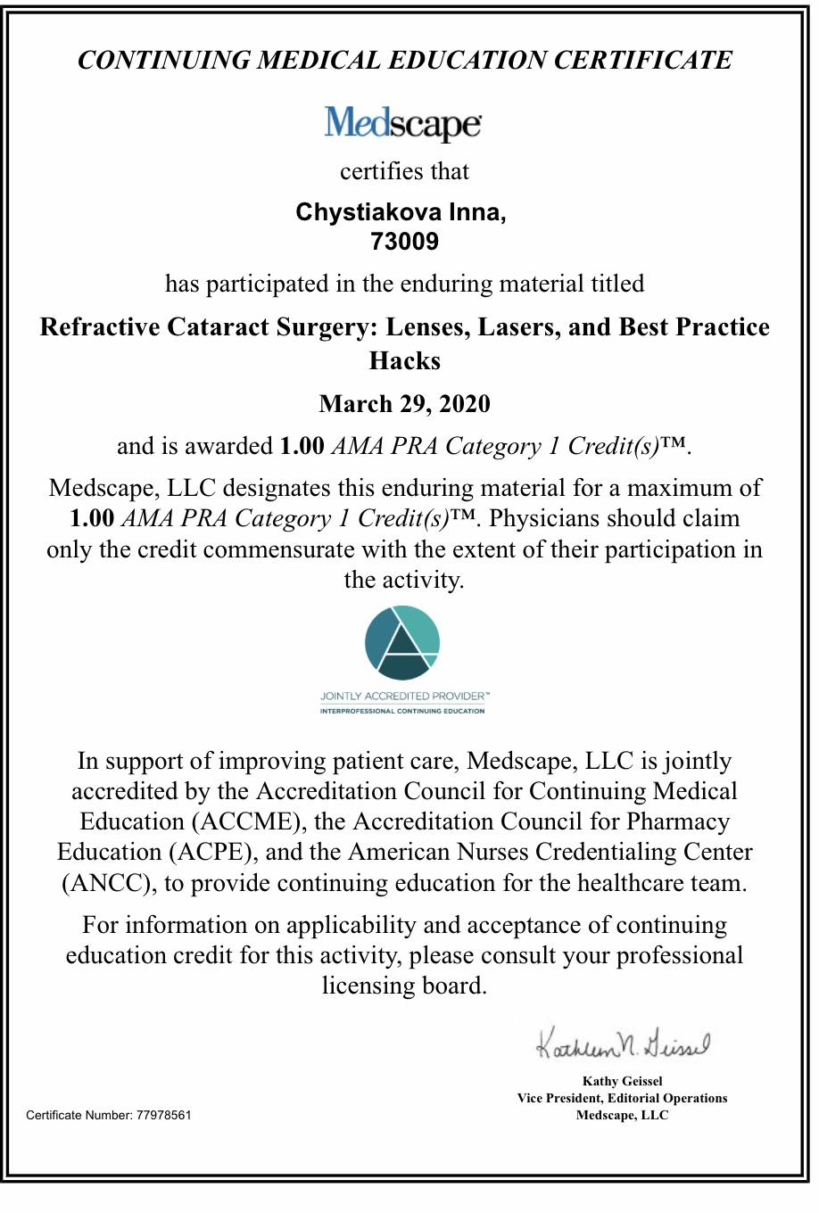 Закінчила Запорізький державний медичний університет в 2015 р. Проходила інтернатуру з 2015 по 2017 рік на базі Обласного центра мікрохірургії ока та лазерних технологій КЗ ХОКЛ м.Херсон та Обласного центру мікрохірургії ока КЗ ЗОКЛ м.Запоріжжя. З 2017 по 2019 рік працювала лікарем-офтальмологом в «Центрі відновлення зору», а з 2021 року по лютий 2022 року - у «Відділенні мікрохірургії ока» та у МЦ “Treviso” м.Херсон. З 2022 по 2023 рік - лікар-офтальмолог в МЦ «Діасервіс». В 2022 році закінчила курси підвищення кваліфікації за темою «Лазерні методи лікування захворювань сітківки. Лазерні методи лікування глаукоми» на базі кафедри офтальмології ЗМАПО м.Запоріжжя. В 2023 році закінчила курси підвищення кваліфікації за темою «Інтравітреальна терапія» на базі кафедри офтальмології ЗДМФУ м.Запоріжжя. В 2023 році пройшла семінар «Основи гоніоскопії».