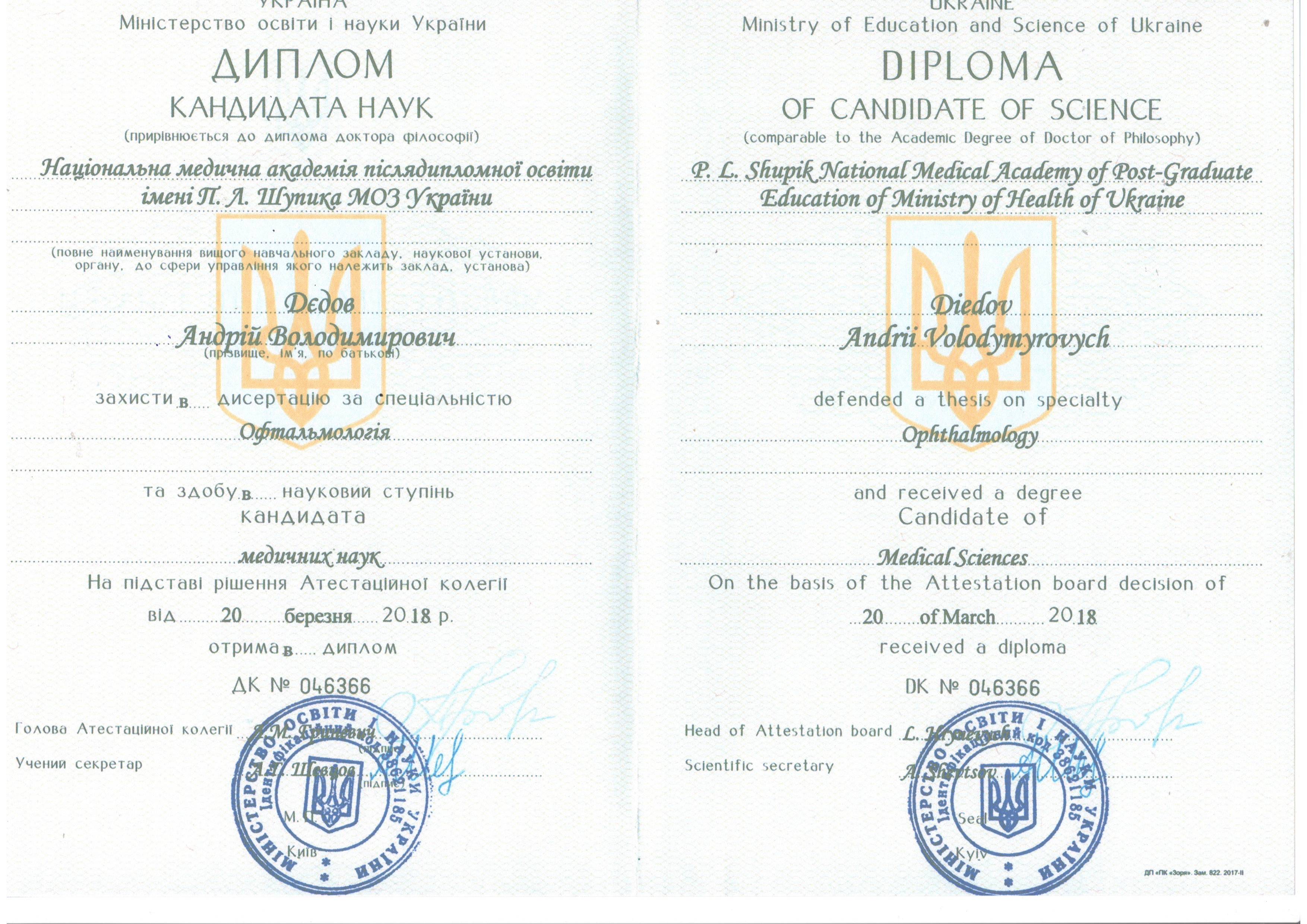 В 2004 році закінчив Дніпропетровську державну медичну академію. З 2004 по 2006 рік проходив інтернатуру за фахом «Офтальмологія» на базі кафедри очних хвороб Запорізького державного медичного університету в очному відділенні Міської клінічної лікарні № 3 м. Запоріжжя. З 2008 по 2010 рік проходив клінічну ординатуру на кафедрі очних хвороб ДЗ «Запорізька медична академія післядипломної освіти» МОЗ України на базі центру мікрохірургії ока КЗ «Запорізька обласна клінічна лікарня». В 2010 році вступив до заочної аспірантури на кафедру очних хвороб ДЗ «Запорізька медична академія післядипломної освіти» МОЗ України, під час якої займався питанням оптимізації хірургічних методів лікування регматогенних відшарувань сітківки. Успішно закінчив науково-практичні курси «Мікрохірургія і факоемульсифікація» в 2009 році на базі кафедри офтальмології Київської медичної академії післядипломної освіти ім. П. Л. Шупика. В 2011 році закінчив науково-практичні курси «Вітреоретинальна хірургія» на базі кафедри офтальмології Київської медичної академії післядипломної освіти ім. П. Л. Шупика. В 2013 році пройшов навчання в European VitreoRetinal Training School на базі European VitreoRetinal Society м. Бремен в Німеччині. З 2016 року лікар-офтальмолог вищої категорії. Захистив дисертацію за спеціальністю «Офтальмологія» за темою, пов’язаною з хірургічним лікуванням відшарувань сітківки та в 2018 році здобув науковий ступінь кандидата медичних наук. Автор понад 20 наукових статей. Доповідач на науково-практични конференціях з міжнародною участю. Провідний хірург та засновник МЦ «РЕТИНА». Основний напрямок діяльності - вітреоретинальна хірургія та хірургія катаракти. Дійсний член Європейської асоціації вітреоретинальних хірургів EVRS та Української асоціації вітреоретинальних хірургів.