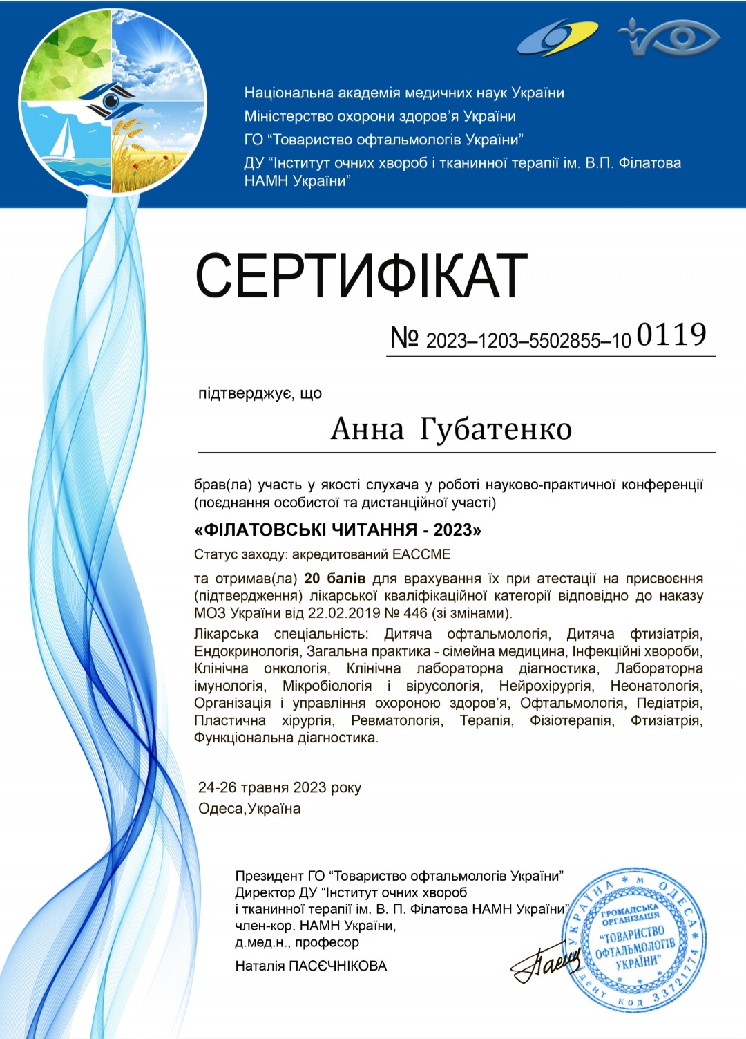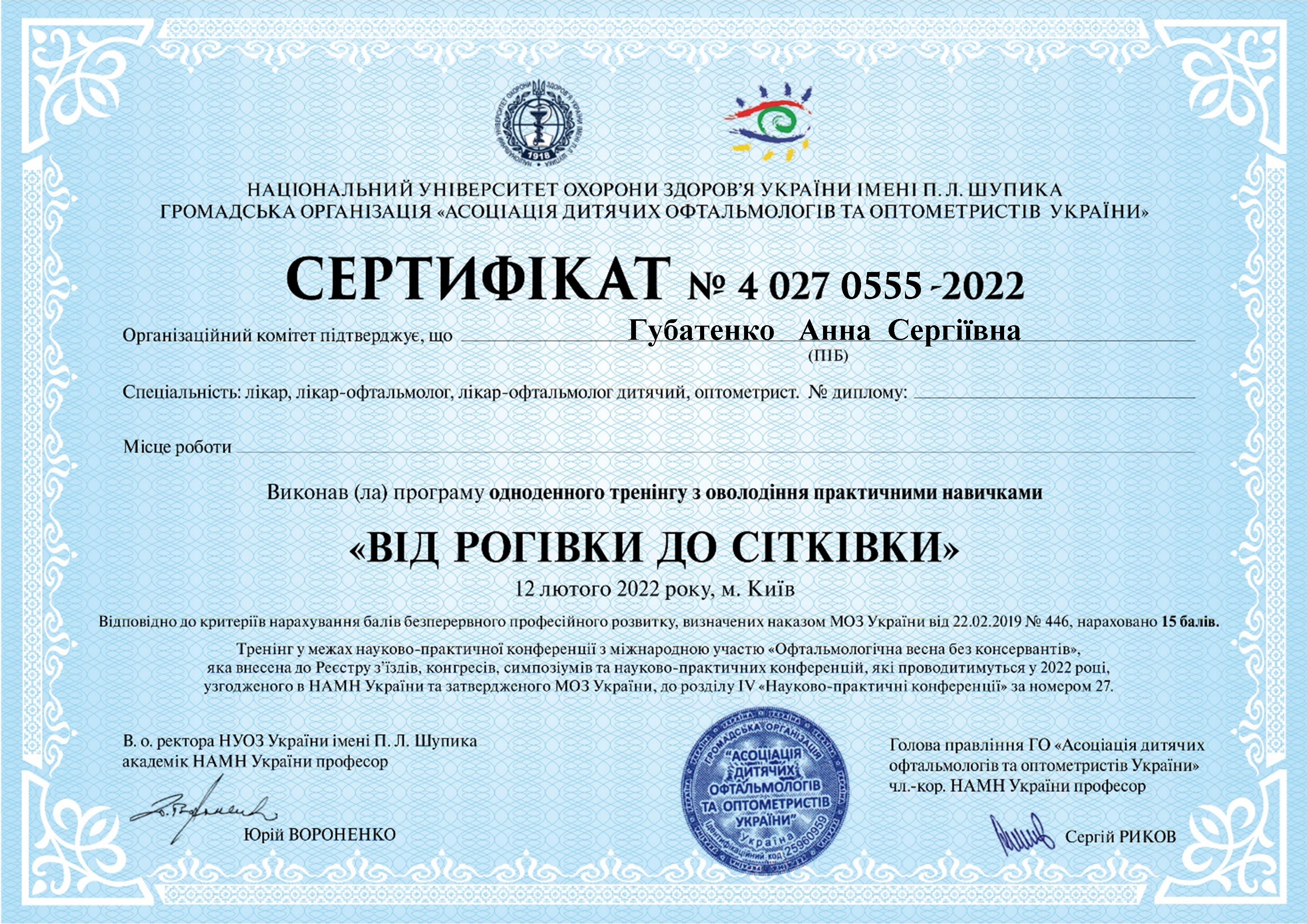 Блискуче орієнтується не тільки в очних захворюваннях, а й у суміжних спеціальностях.